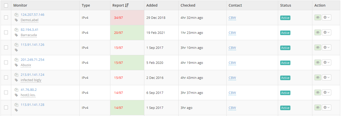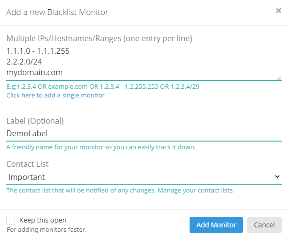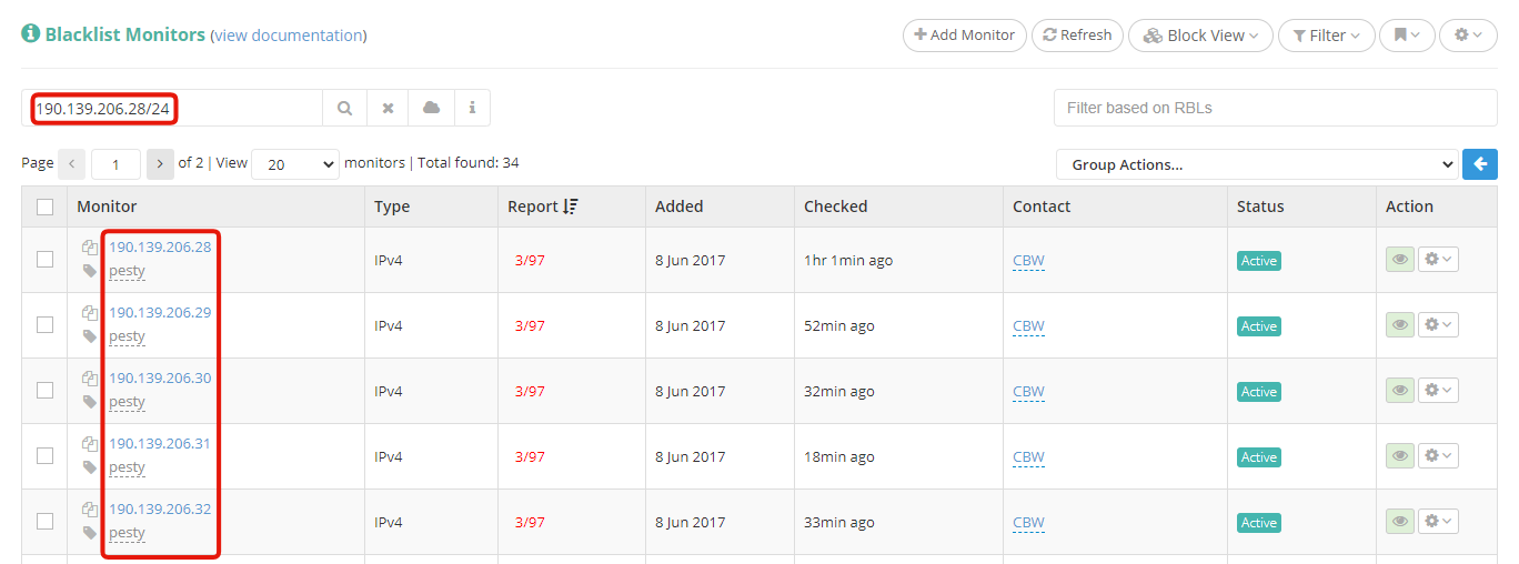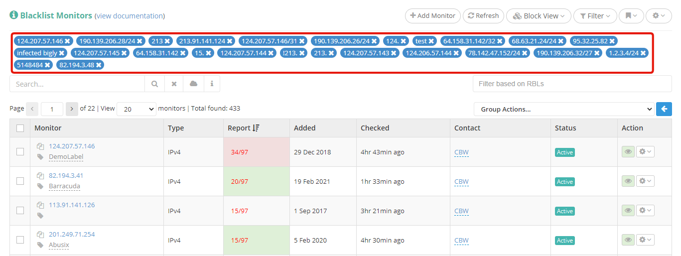 Once you've added all of your IPs and domains to be blacklist monitored, you'll need an efficient way of searching through all of them. Using our labeling system to assign keywords to your monitors is the easiest way to neatly organize and quickly find them afterwards. You can assign labels based on purpose (i.e.: 'emailing', 'webservers', etc.), based on your own clients (i.e.: 'client1', 'client2', etc.), or any other way you see fit to label your monitors. When it comes to finding the monitors you are looking for, this is where our search engine comes into play, allowing you to easily search by label, by IP/domain, and even by IP block. This way you can immediately find the IPs or domains that you are looking to work on, or check up on.