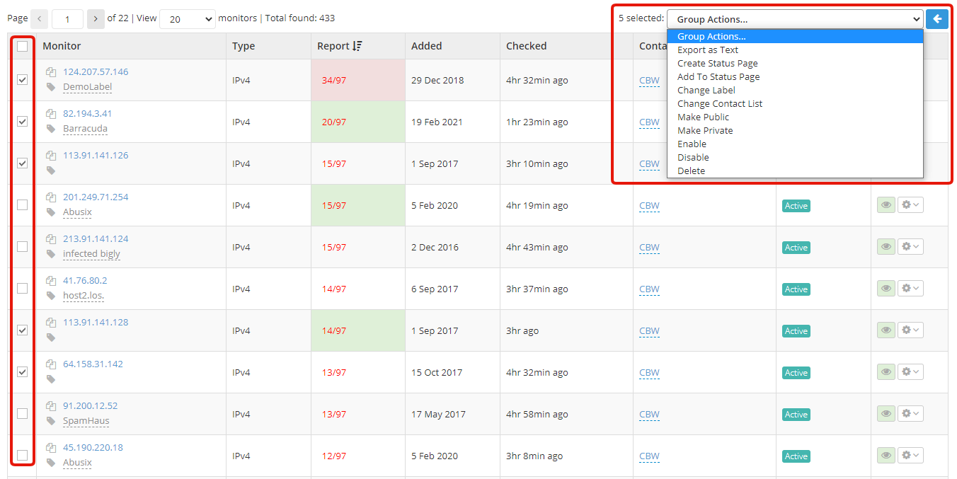 Managing multiple monitors at once can easily be done with just a few clicks. Our 'group actions' feature allows you to select multiple monitors at once, and apply an action to all of them, such as: disabling/enabling them, creating a status page with them, removing them, changing their label, etc. This feature comes in handy when combined with our search engine, for example: search for a particular label, select all of the monitors with that label, and use 'group actions' to change their label to a new one.