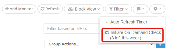 If you wish to do so, you can initiate an on-demand check on all of your blacklist monitors at any point. This would force a recheck on all of your IPs and domains, right on the spot, without having to wait for the next system automatic recheck. The 'on-demand check' is very useful for when you wish to immediately check for any blacklisting/delisting changes affecting your blacklist monitors, thus skipping time waiting in the processing queue.