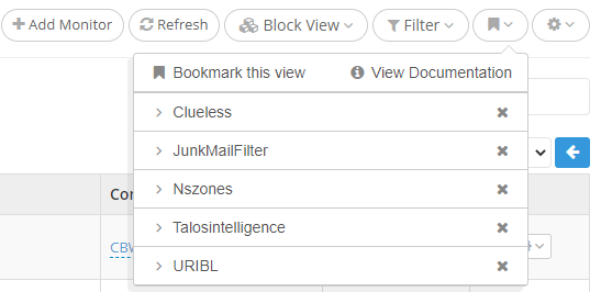 Easily save specific 'views' of your blacklist monitoring workspace by using 'bookmark view'. The way it works: after you've filtered your monitors, and/or searched through them, you can use 'bookmark view' to save that exact filter/search configuration, so you'll have it available for future use, just one click away. For example, if you wish to find all IPs belonging to Client-1 that are blacklisted on the SpamRats RBLs, you search for the 'Client-1' label, then filter the results based on RBLs to only show the ones blacklisted on SpamRats blacklists, and then save this view using 'bookmark view'. Now, the next time you'll want to find the same results, you'll have a bookmark for your query, so you don’t have to perform all of the steps again.