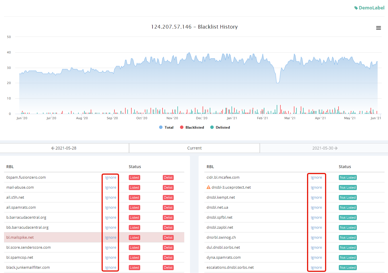 If you think a blacklist is irrelevant for your particular use-case, or if you simply wish not to monitor a certain blacklist, you can simply ignore it from any of your blacklist reports. The 'ignore' is global, so you only have to do it once, on just one of your blacklist reports, and it'll affect your entire account. Ignoring a blacklist will simply not check your IPs and domains against it anymore, and you will not be notified if or when you get blacklisted on this RBL anymore. This feature is very useful for users who dislike certain RBLs and their practices, or that feel that certain RBLs are not worth monitoring.