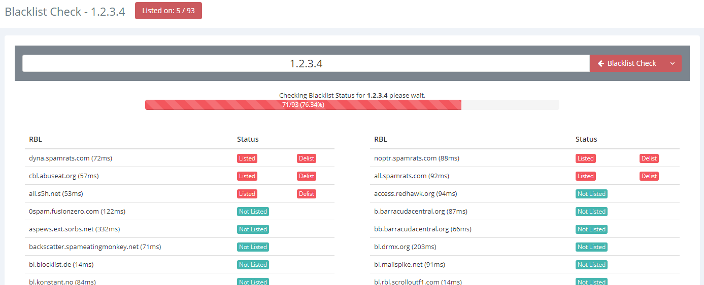 You can use our platform's Blacklist Check to instantly check any of your IPs or domain names against all of our monitored RBLs. The check is performed in real-time and you can immediately view its results. Furthermore, every blacklist check will generate its own public blacklist report, which you can share just as you'd do with your own blacklist reports. This feature will help you if you have an immediate need to check an IP or a domain name against our monitored blacklists.