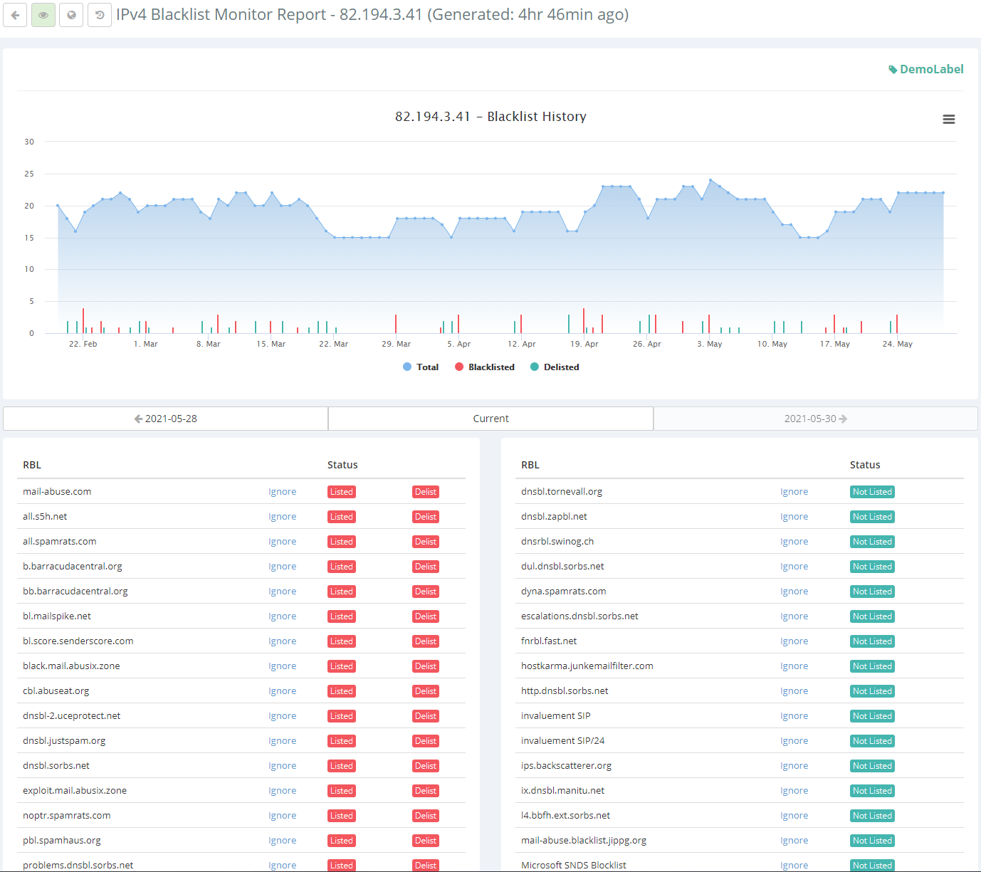 Each of your blacklist monitors will have their own blacklist report where you can easily see all of the blacklists it is currently listed on. You'll also be provided with delisting links for all of the blacklists where your IP or domain is blacklisted on. Following these links will take you exactly where you need to go on the blacklist's website to follow their delisting procedures. Furthermore, on each blacklist report page you can also see the blacklisting history graph for this monitor, and even click within the history graph on any past dates to go back in time and see its blacklisting status at that point in time. Last but not least, the blacklist report will also include the 'change history' log where you can easily see all of its blacklisting/delisting activity over time, in chronological order. These blacklist reports are private by default, but you can make each of them public and share them with your colleagues or clients. You'll also be able to fully white label your blacklist reports by using your own domain/subdomain, logo, favicon, color scheme, etc.