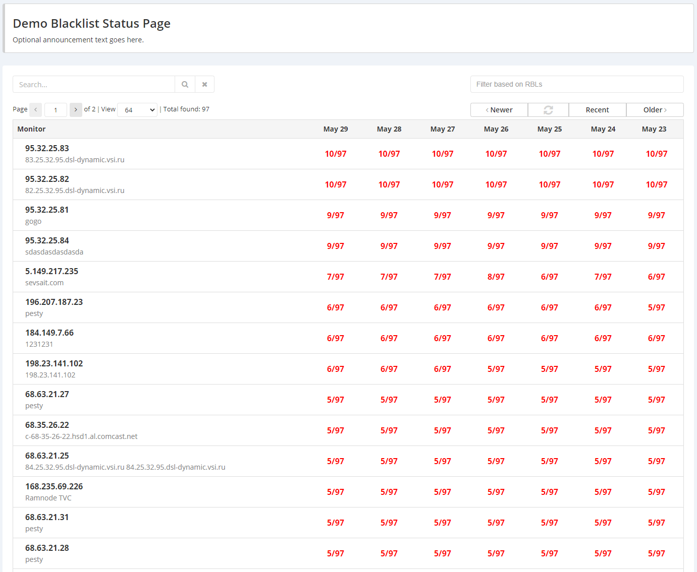 Bundle up multiple blacklist monitors into one status page, and share it with your coworkers or with your customers. For example, you could create an individual status page for each of your clients that would include only their IPs/domains, so they can see their blacklisting status on their own. Each status page will only display the monitors that you've selected to appear on it, their blacklisting status, and links to the blacklist reports for each of them. Just as with our blacklist reports, you can also fully white label your status pages as well, using your own domain/subdomain, logo, favicon, color scheme, etc., allowing you to offer a more personalized experience for your customers or colleagues.