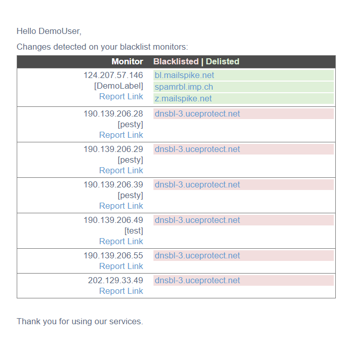 Our color indicators will help you spot the most recent blacklisting/delisting changes within your blacklist monitors. The red color background means that the particular IP or domain has recently been blacklisted, while the green background means it has been recently delisted. This way you can quickly observe, at a glance, which of your monitors require your immediate attention.